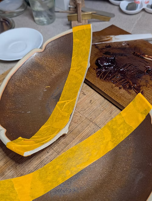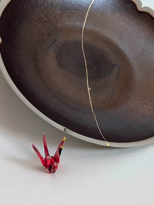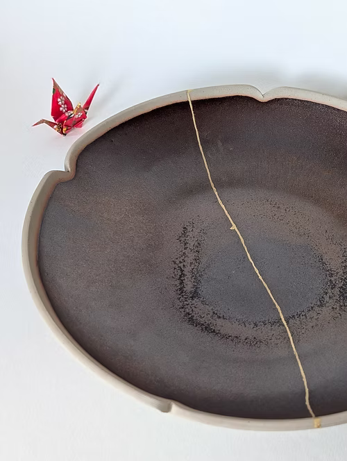 Une réparation faite dans le respect et selon la méthode traditionnelle japonaise du Kintsugi pour un usage alimentaire.